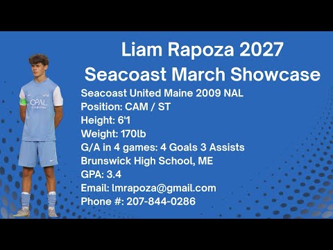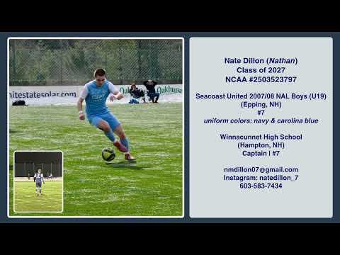 Highlight reel showcasing Nate Dillon (Nathan Dillon) playing for Seacoast United's 2007/08 Boys NAL (U19) team at Seacoast United March Showcase (March 6-8 in Epping, NH). Reel displays Nate's shots on goal, and plays down the left wing, including passes, crosses into opponents box, and defensive cover–tracking back to cover for the left back.