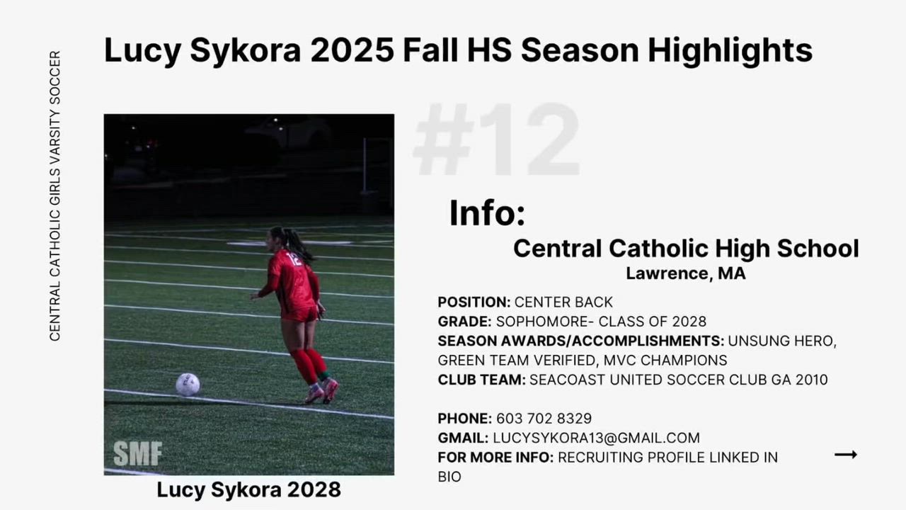 My highlights from the 2025 fall High School season! Sophomore Class of 2028 | Girls Varsity | Central Catholic High School-Lawrence, MA | Center back #12 | Head Coach: Jami Hayden (jhayden@centralcatholic.net) |